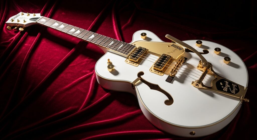 純白のボディにゴールドパーツが輝く「ホワイトファルコン」を筆頭に、そのデザインは多くのギタリストの憧れの的となっています。