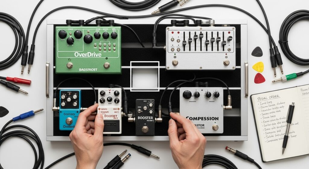 例えば、「BOSS BD-2 (歪み)」「BOSS DD-8 (ディレイ)」「BOSS TU-3 (チューナー)」といった組み合わせは、ジャンルを問わず使える王道セッティングです。