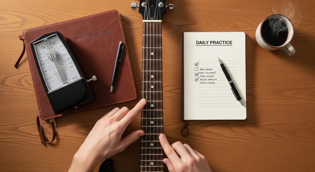 この記事では、ギターの基礎練習の重要性から具体的な練習メニュー、そして継続するためのコツまでを詳しく解説しました。